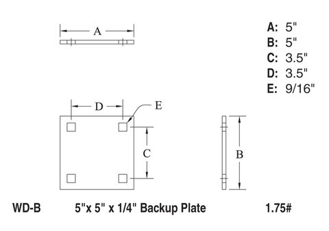 5″” x 5″” x 1/4″” Backup Plates are used to backup Single T Female (WD-TF) and Single T Male (WD-TM) connectors. The backup is also used for backing Chain Retainers (WD-CR).