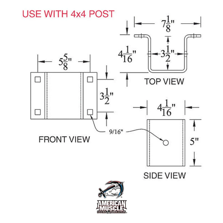 Easily and securely attach standard 4×4 wood uprights to your dock’s framing using our sturdy 4×4 Bracket. This bracket provides a stable base for various applications, including the construction of safe and reliable handrails. (Please note: 4×4 wood post is not included with the bracket.)