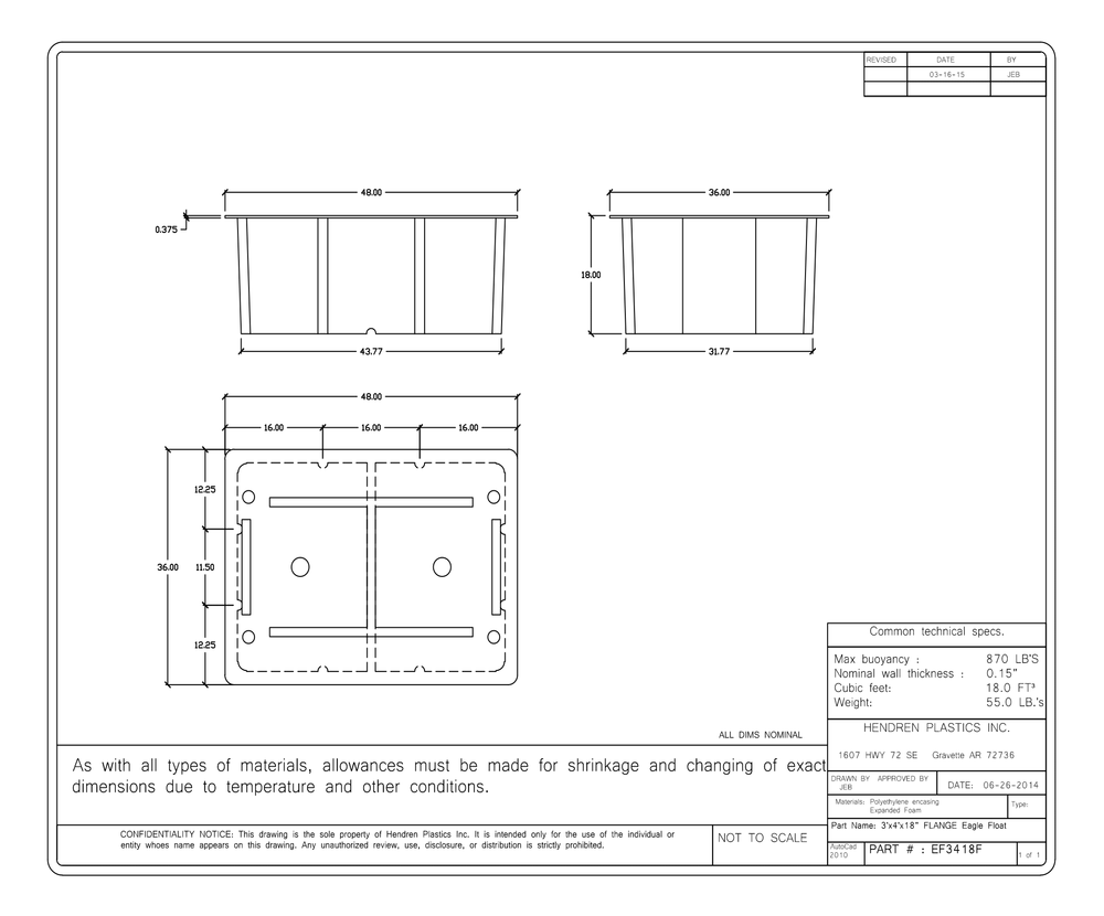 | Dock Floats Available in the following depths (in inches) and net buoyancy in Lbs: | 36x48x12 – 550 lbs, 36x48x16 – 750 lbs, 36x48x18 – 870 lbs, 36x48x20 – 960 lbs, 36x48x24 – 1140 lbs |