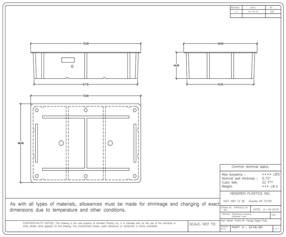 Eagle Floats™ are manufactured by Hendren Plastics utilizing the latest rotational molding equipment with cutting edge technology such as programmable logic controller and infrared telemetry feedback. Our state of the art equipment, in-house tooling and engineering allow us to produce over 80 sizes of high quality floats at the most affordable prices in the industry. Eagle Floats™ are available in two profiles, the standard attachment with molded in mounting slots and a flanged version with a 1-1/2” wide and 3/8” thick heavy duty mounting flange which encompasses the perimeter of the float. Sizes range from our 8″ rowing dock float to our colossal 4x8x36, providing over 5,000 lbs of buoyancy.