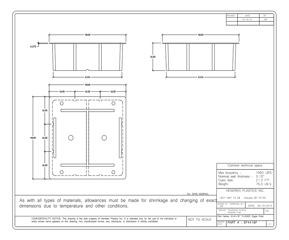 | Dock Floats Available in the following depths (in inches) and net buoyancy in Lbs: | 48x48x16 – 1060 lbs, 48x48x20 – 1350 lbs, 48x48x24 – 1530 lbs |