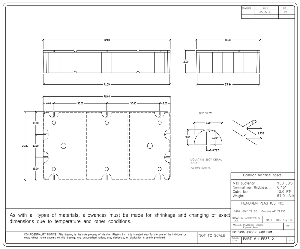 | Dock Floats Available in the following depths (in inches) and net buoyancy in Lbs: | 36x72x12 – 950 lbs, 36x72x16 – 1270lbs, 36x72x20 – 1580 lbs, 36x72x24 – 1850 lbs, 36x72x28 – 2150 lbs, 36x72x32 – 2430 lbs |