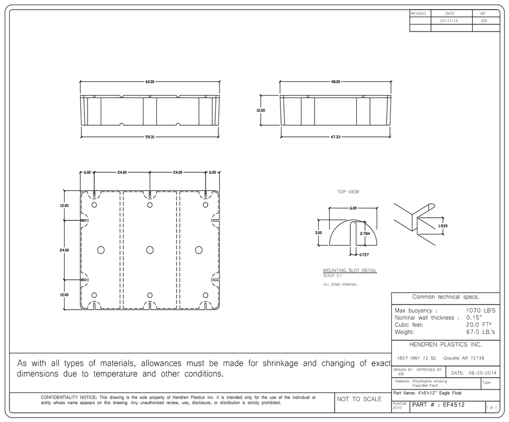 | Dock Floats Available in the following depths (in inches) and net buoyancy in Lbs: | 48x60x12 – 1070 lbs, 48x60x16 – 1420 lbs, 48x60x20 – 1750 lbs, 48x60x24 – 2100 lbs |