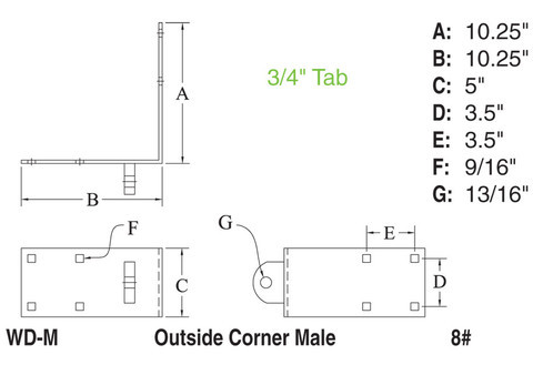 Has two 2.5″” tabs and is used with Outside Corner Male (WD-M) or Single T Male (WD-TM) connectors. The tabs are pre-drilled to accommodate a 3/4″” pin or bolt.
